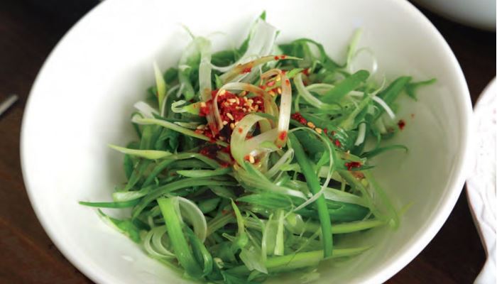 Enjoy this crisp, simple salad, which has just a hint of heat, with Bulgogi, Grilled Pork Belly, or L.A.–Style Beef Short Ribs. Serves 2 or 3 INGREDIENTS 7 scallions 2 tablespoons soy sauce 1 teaspoon sugar or honey 1 tablespoon distilled white vinegar 1 tablespoon Korean hot pepper flakes (gochu-garu) 1 tablespoon toasted sesame […]