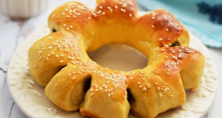 - Mix the flour, yeast, ¼ cup sugar, and cardamom in a large bowl and make a well in the center. Add the date puree, saffron rose water, egg, date syrup, and melted butter. Mix the ingredients in the well as much as you can before bringing in the flour to make a rough ball of dough.