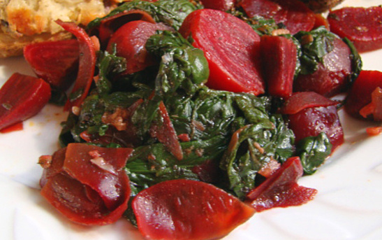 This is one of my favorite ways to prepare beets. The dish comes together in about 15 minutes and makes use of the whole beet, root, greens, and all. I loathe wastefulness in the kitchen and make an attempt to find a use for every little bit of every plant and animal that finds its way to my chopping block. I gently braise the sweet beet roots in butter and chicken broth before stirring in the tender greens with a bit of chopped mint and a splash of apple cider vinegar, which helps to cut the beets’ pronounced earthiness. Take care to use young, small beets because their greens are much more tender and softer in flavor than those of larger beets. Beets go well with roast pork, whose natural sweetness complements the earthiness of beets. From time to time, I also pair beets with red meats like lamb.