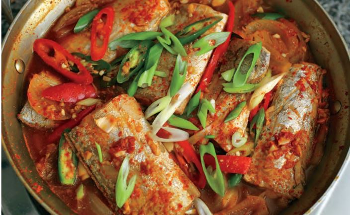 Flavored with aromatics and cooked with vegetables, this fish side dish comes with a broth that is satisfying and hearty. You can scoop the flesh from the fish with a spoon—it will come away from the bones easily. In Korea, this kind of dish is known as a “rice thief” ( bapdoduk)—it goes so well with rice that it makes the rice disappear as though it were stolen. So named because it resembles a long belt, beltfish is also known as hairtail. It is popular in Korea but less well known here. Fresh mackerel is a good substitute that’s widely available.