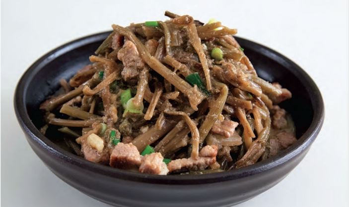 In Korea, sweet potatoes are harvested in the fall, so that’s when we get the freshest sweet potato stems. The stems are long, narrow, green, and very succulent and sweet, and Koreans use them in soups, stews, side dishes, and even kimchi. Farmers also dry some of the stems until they look like hard threads. I learned this method for preparing the dried stems from one of my friends in Korea, who had learned it from her mother-in-law in the country. Small pieces of pork belly and a bit of ground perilla seeds give the rehydrated stems a deep, rich flavor. Be sure to soak the stems thoroughly. This is a long process, so start the day before. You’ll be surprised at how juicy and succulent the stick like stems become.