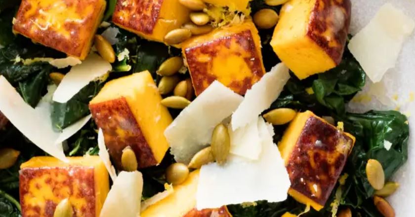 WHY THIS RECIPE WORKS Gnudi are gnocchi-like dumplings that are traditionally made with strained ricotta and nothing more than a light dusting of semolina flour—essentially a ravioli filling minus the pasta. The result is something much more cloud-like and ethereal than gnocchi. In this version, we used butternut squash instead of ricotta to create the ultimate fall dish, with wilted kale, Parmesan, and pumpkin seeds. The challenge in trying to make these dumplings was getting them to hold together without diluting the squash flavor with large quantities of binders such as flour and eggs. So we used a little tapioca starch and egg white powder to effectively bind water and form a stable but supertender gel. The dough was too delicate to knead and roll out, so instead we baked it in a water bath and then cut the gnudi by hand. Do not substitute raw egg whites for the egg white powder, as the extra water will ruin the texture of the gnudi. You will need a 12-inch nonstick skillet with a tight-fitting lid for this recipe. It may seem strange, but the dish towel raises the baking pan off the bottom of the roasting pan, preventing the gnudi from overcooking on the bottom, and also provides traction for the baking pan so it doesn’t slip when removing the roasting pan from the oven. A few gnudi will not be a perfect 1 by ¾-inch size. If you prefer, trim the whole block into a 6-inch square and then cut into 48 even pieces.