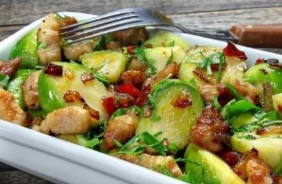 Serves: 2 INGREDIENTS: 6 oz. cubed pork 2 tbsp. coconut oil 1 pound Brussels sprouts, halved 1/2 large onion, chopped Salt and ground black