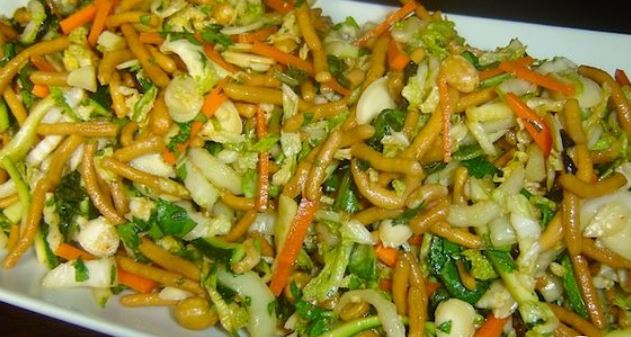 MENU DESCRIPTION: “Mixed greens, carrots, zucchini, green onions, peanuts and crunchy cappellini. Tossed in