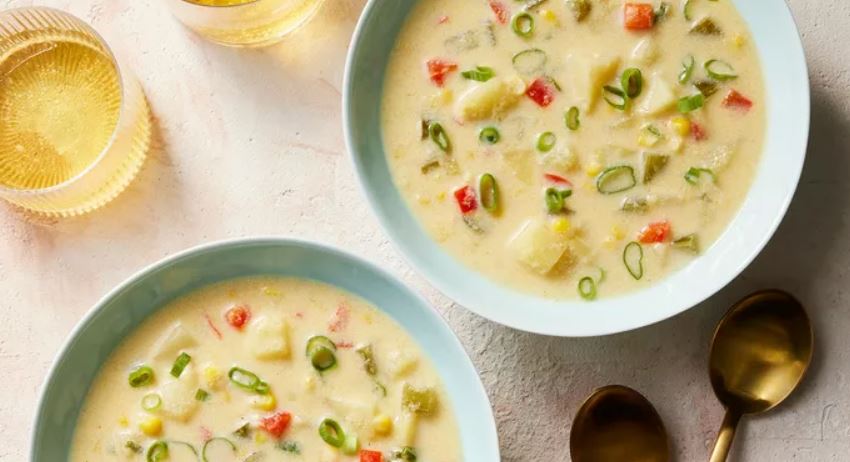 Because so many new corn hybrids have extended the corn season, we have the opportunity to make fresh corn chowder more often than in the past. Nothing can equal the sweet, rich flavor of the “milk” from fresh corn cobs when they are used in the stock. Our version has no cream, but is plenty rich without it.