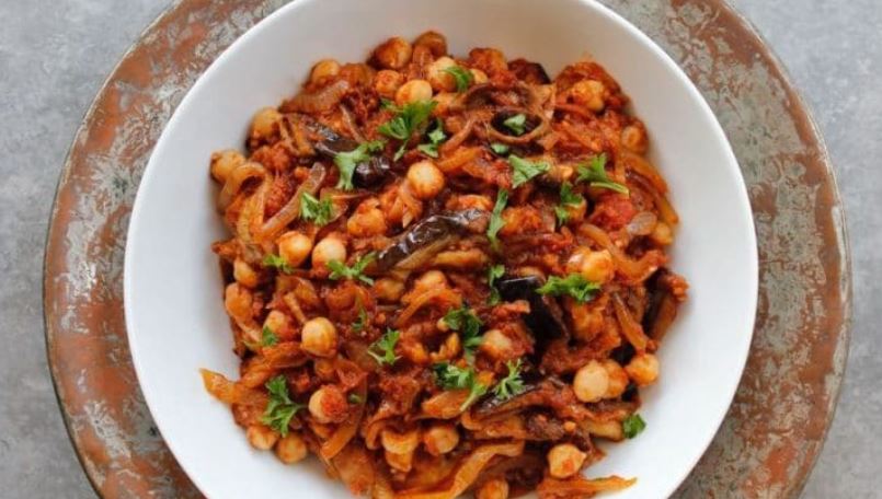 4. Add 1/4 cup water and boil, stirring the juices up from the bottom of the pan. Add the tomatoes, eggplant, chickpeas, 1 cup water, and 1 tsp. salt. Bring to a boil and then simmer, covered, until the vegetables are tender, about 25 minutes, stirring once or twice.