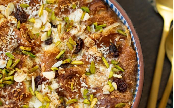 Umm ali is the classic Egyptian dessert, an Arab version of bread pudding made with layers of very thin crisp flatbread and toasted nuts soaked with sweetened milk. I use a larger quantity of nuts than most people to give the