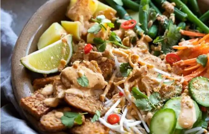 This is an easy version of the Indonesian salad that is characterized by its spicy peanut dressing. For added protein, sliced tempeh can be added.