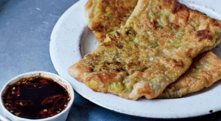 - Set a wire rack in a rimmed baking sheet. Place the skillet with the vegetable oil over medium heat and when the oil is hot (you can judge by dropping a piece of bread into the oil; if the oil bubbles around it, then it is ready), flatten one martabak slightly with your hands, making sure not to tear the dough, and slide it into the hot oil. Fry for 2 to 3 minutes on each side, or until crisp and golden. Remove to the wire rack to drain off the excess oil. Fry the remaining martabaks. Serve hot with the dipping sauce.