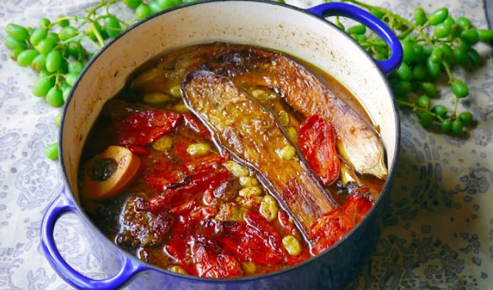 - Carefully transfer to a serving platter, making sure you do not mash up the eggplant slices. Serve very hot, sprinkled with pomegranate seeds, alongside the rice.