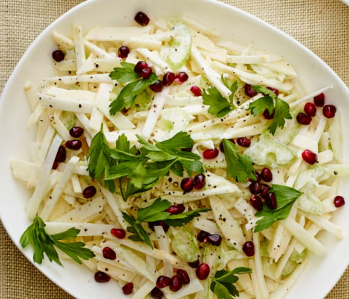 - Toss the kohlrabi, apples, pomegranate seeds, and parsley together in a large bowl.