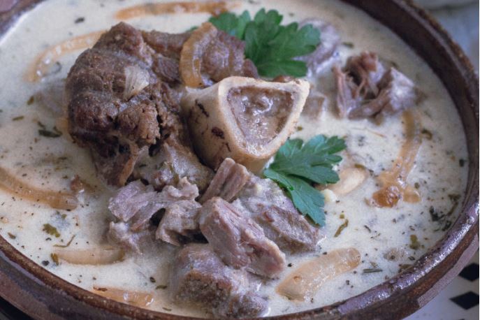 - When the meat and onions are done, return the yogurt sauce to medium-low heat and stir until it starts simmering. Add the meat and onions and stir in the reserved herb-garlic mixture. Add ¼ cup (60 ml) meat broth and simmer, stirring gently so as not to undo the onions, for 3 to 5 more minutes, until the onions are just tender.
