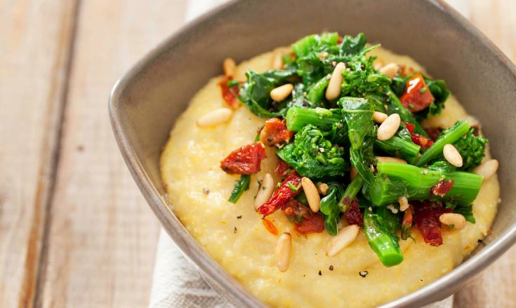 PARMESAN POLENTA WITH BROCCOLI RABE SUN DRIED TOMATOES AND PINE NUTS