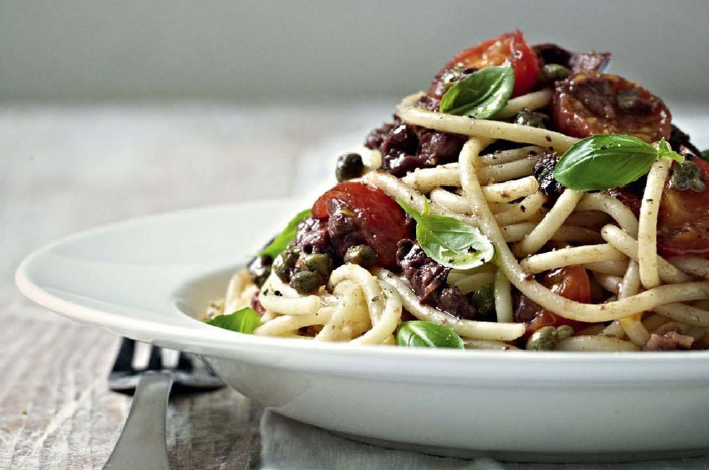 Pasta and tomato sauce has become a midweek standby in every home. In this classic Italian dish, we are taking that basic sauce to another level by adding a few pantry staples—chiles, anchovies, olives, and capers. Ready in the time it takes for the pasta to cook, and utterly delicious.