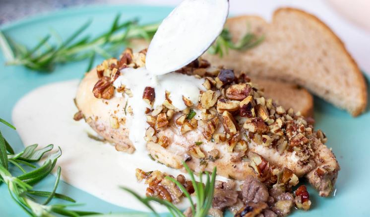 - Pecan Chicken with Blue Cheese Sauce showcases the magic that happens when traditional Southern flavors meet a contemporary twist. This beloved dish, born from the fertile grounds of pecan orchards and the rich culinary heritage of the South, has evolved into a culinary masterpiece adored across the nation. The crunchy pecan crust complements the tender chicken, while the velvety blue cheese sauce adds a touch of sophistication to an otherwise rustic dish. Whether enjoyed at a cozy family dinner or a grand gathering, Pecan Chicken with Blue Cheese Sauce promises to delight palates and leave a lasting impression on all who partake in its delectable flavors.