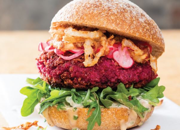 WHY THIS RECIPE WORKS Vegetarian or vegan burgers are often bean-based, but why not include beets? They bring both a lighter texture and a sweetearthy flavor to the pinto beans. We added heft with bulgur and used ground nuts to provide meaty richness. Garlic and mustard deepened the savory flavors. While the bulgur cooked, we pulsed the other ingredients in the food processor. To bind the burgers, we found a surprising ingredient: carrot baby food. This added the necessary tackiness, and its subtle sweetness heightened that of the shredded beets; plus, it was already conveniently pureed. Panko bread crumbs further bound the mixture and helped the patties sear up with a crisp crust. When shopping, don’t confuse bulgur with cracked wheat, which has a much longer cooking time and will not work here. Use the large holes of a box grater or a food processor fitted with a shredding disk to shred the beets. Serve with your favorite burger fixings.