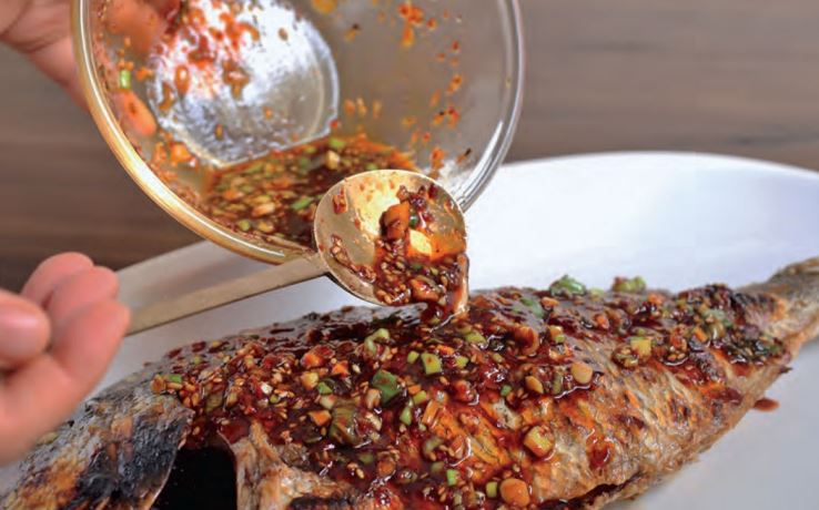 Roast a whole fish and cover it with a spicy seasoning sauce, and it becomes very special indeed. The lettuce on the serving platter is not merely decorative: The juices from the fish and the sauce soak into it, turning the leaves into a delicious salad to eat once the fish is gone. Serve the dish with rice to temper its spiciness. When I find large fresh porgies for sale in Chinatown fish markets, I usually buy three or four, sprinkle them with a little salt, and freeze them for later. If you’re not crazy about cleaning fish, ask the fishmonger to do it for you.