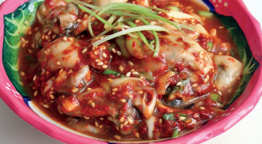 In the early mornings in the harbor city of Yeosu, I used to follow my mother to the open-air market. There was always a gaggle of women who came daily from a nearby island to sell oysters that they had harvested among the rocks by the shore. They squatted behind their bowls of very small, very sweet wild oysters, shucking them and selling them to passersby. My mom would bring the oysters home, mix them with a quick seasoning sauce, and serve them as a breakfast side dish. They were full of the flavor of the fresh sea. If you live in a place where very fresh oysters are available, use them. You may be able to find containers of shucked oysters at your fish market