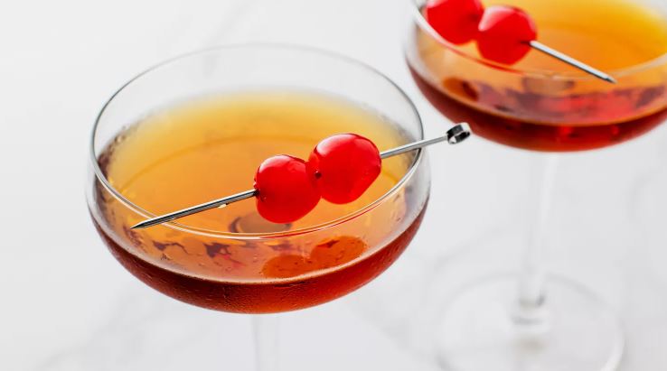 - Garnish each glass with a maraschino cherry or lemon twist and serve.