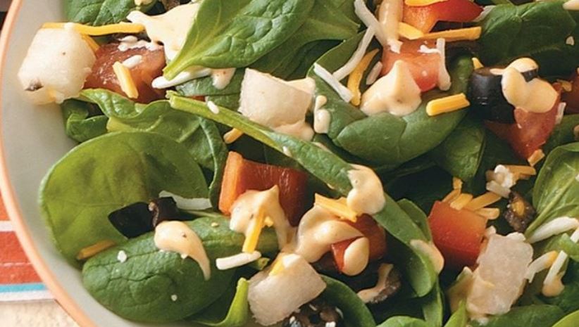- In a salad bowl, combine the fresh baby spinach, chopped tomatoes, cubed peeled jicama, shredded Mexican cheese blend, chopped sweet red pepper, and sliced ripe olives. Toss gently to combine all the ingredients evenly.