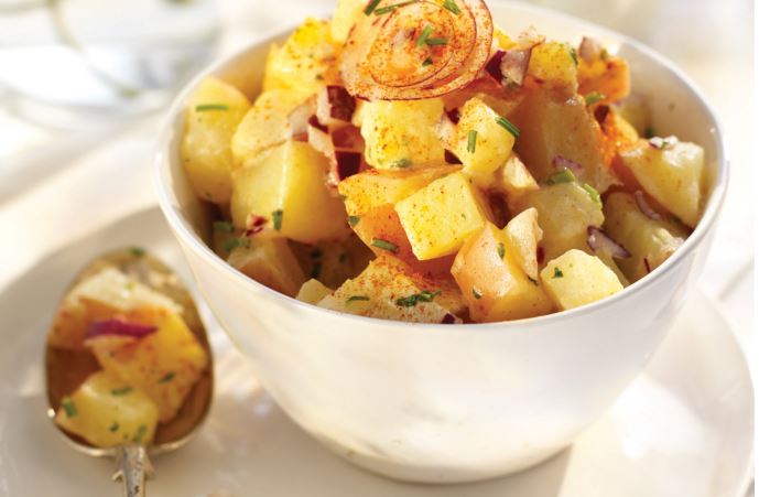 - Stir the dill, chives, and red onion into the potatoes, then season to taste with salt and pepper.